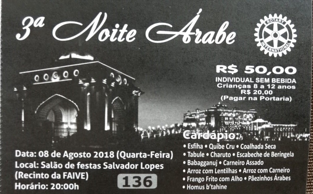 Na noite do dia 08 de julho, no restaurante do Rotary Club de Presidente Venceslau localizado no recinto da FAIVE, acontecerá a 3ª Noite Árabe, com comidas típicas e muita animação.